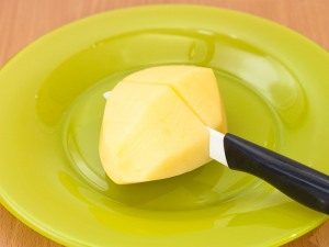 - Umyte a olúpajte zemiaky, rezajte ostrým nožom naprieč hľúzami (nie úplne) vo vzdialenosti 1 cm od seba.