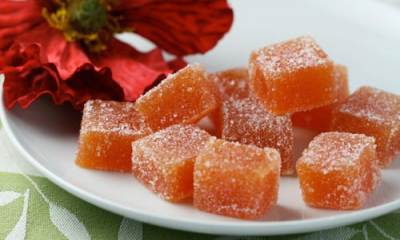 - Po čase, keď marmeláda dostatočne vyschla, nakrájajte na malé štvorčeky a ponorte ich do granulovaného cukru alebo prášok.