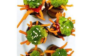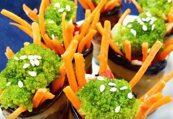 - Zhromažďujeme hod. Dajte nastrúhaný tanier baklažánu syr s cesnakom, mrkvové tyčinky, plátok paradajok, brokolica, vypnite širokú časť.