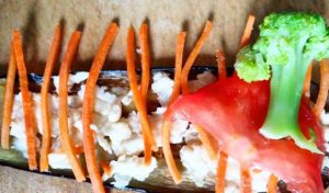 - Rajčinu nakrájame na tenké plátky, nastrúhajte mrkvu dlhou slamkou.
