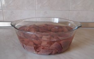 Bravčovú pečeň umyjeme, nakrájame na stredné kúsky a zalejeme voda po dobu 30 minút.