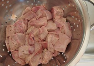 Po 30 minútach zlikvidujeme kúsky bravčovej pečene v cedníku.