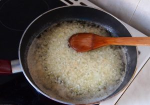 Na panvicu posielame rozpustený bravčový tuk, nakrájanú cibuľu a smažte 4-5 minút, kým nezmäkne.
