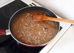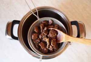 Pripravené kúsky pečene vložte do vyprážanej cibule, nasekaný cesnak, nalejte vodu na pokrytie obsahu, prikryte a varte na miernom ohni 45 – 50 minút.