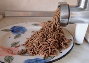 Kusy pečene prechádzajú mlynčekom na mäso (s najväčšou tryskou) tenké diery).