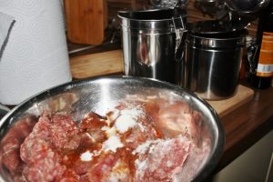 Prísady sú pre šunku 2 litre. Bravčová panenka opláchnuť, nakrájať na stredné kúsky a poslať do misky plnka.