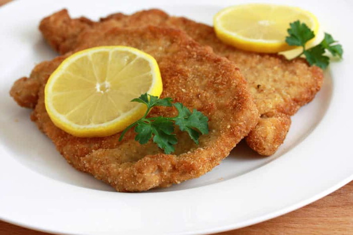 Porciované mäso z jedného kusa, múka, mleté vajcia, strúhanka a rozptýlená v horúcom oleji (veľká množstvo). Rýchlo smažte z 2 strán na vysoké teplo a roztierajte na odstránenie prebytočného oleja z papierových utierok.