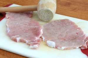 Plátky bravčovej panenky umyte a dobre porazte, aby mäso bolo ukázalo sa, že je veľmi tenký a veľký. pripravený plátky posypeme soľou a mletým korením.