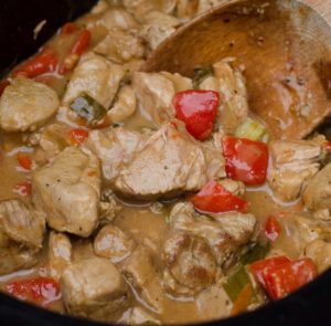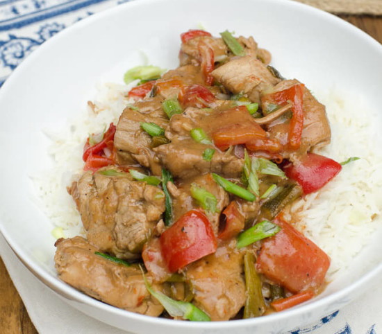 Varte lahodný bravčový guláš so sladkou korenie, cibuľa a zelená cibuľa. Pripravíme omáčku z paradajkovej pasty a kyslá smotana. Mäso teda dopadne nežne.