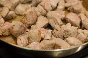 Bravčové mäso umyte, nakrájajte na stredné kúsky, poslať na olej, posypeme mletým korením a opečieme na miernom ohni otvorené, kým kúsky nie sú ľahko opečené. Opláchnite korenie, vyberte – semená, membrány a nakrájané na malé kúsky a – zelená cibuľa – cesnak jemne nasekajte lisom.