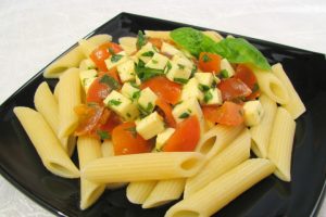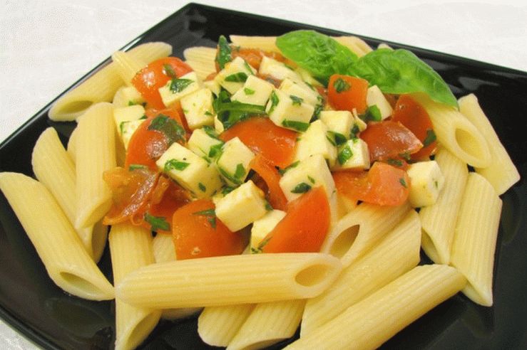 Chutné vegetariánske cestoviny s paradajkami a paradajkami mozzarella. Toto hlavné jedlo sa odporúča variť doma mozzarella, iba tento syr má jemnú, sviežu chuť a zároveň je mierne elastický. Vyberte si cestoviny z tvrdej pšenice, nemusia sa umyť.