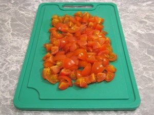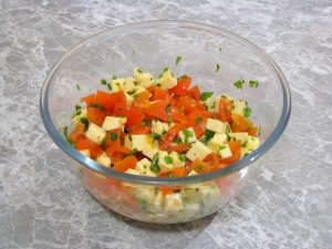 - Do odmernej misky jemne premiešajte paradajky, syr, bylinky soľ a korenie.