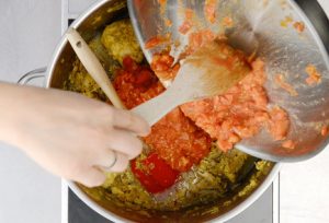 - Kým sú kuracie kúsky dusené, jemne nasekáme a paradajky dusíme s pridaním paradajkovej pasty.