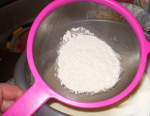 Potom preosejte pšeničnú múku cez sito. Je to potrebné aby bol chlieb jemný a bez rôznych nečistôt, ktoré sa nachádzajú v múke. Potom nalejte kvasnice, soľ a cukor.