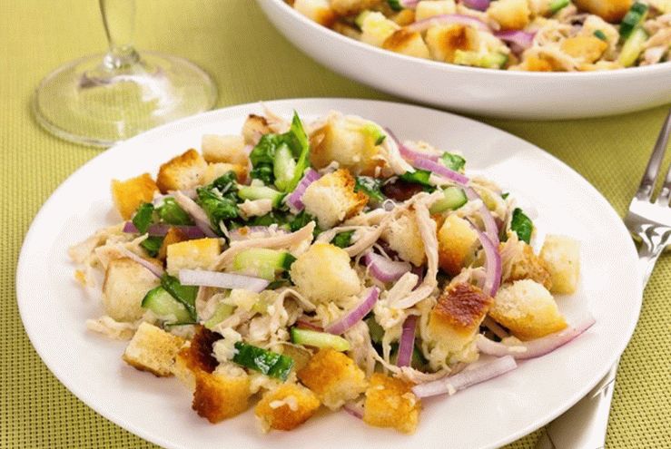 Chutný a uspokojivý šalát s varenými kuracími prsiami a sušienkami, varené doma, v šalátovom octe 6% nahraďte octom jablčného muštu a šalát zmiešajte priamo tesne pred podávaním, aby sa zachovali ostré vlastnosti sušienky.