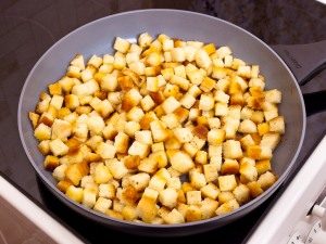 - Chlieb nakrájajte na kocku a smažte na masle, až kým nebude mať zlatohnedú farbu.
