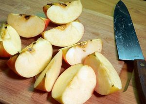 Olúpeme jablko zo semien, nakrájame na malé kúsky a dať poháre na iné prísady.