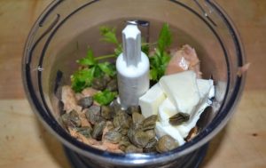 Vložte tuniaka, maslo, kapary, majonézu a petržlen.