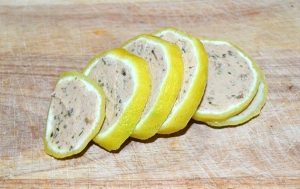 Chladené plnené citróny nakrájajte na malé kúsky, položte na tanier, ozdobte bylinkami a ihneď podávajte.
