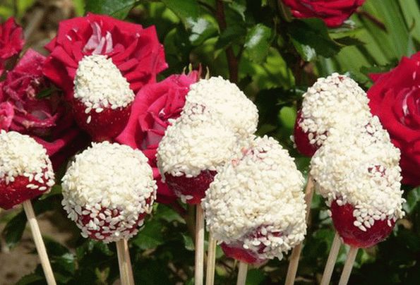 - Každý bobuľku ponorte do jogurtu a sezamu On špízy.