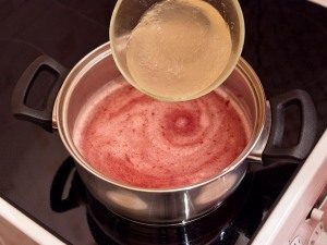 - Nalejte 500 l vody do hrnca, pridajte ríbezle, cukor, mieša sa, kým sa cukor úplne nerozpustí.