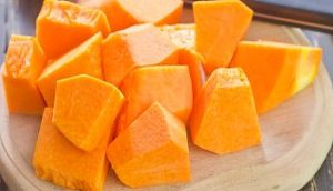 - Najprv musíte rezať kôru z tekvice, odstrániť všetky semená. Nakrájajte mäso tekvice na veľké kúsky. Naplňte panvicu vodou pridanie sódy.