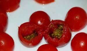 - Opatrne odrežte vrcholy paradajok bez toho, aby ste poškodili steny čerešňa, s čajovou lyžičkou, vyberte dužinu a zapnite papier obrúsky, vypustite šťavu.