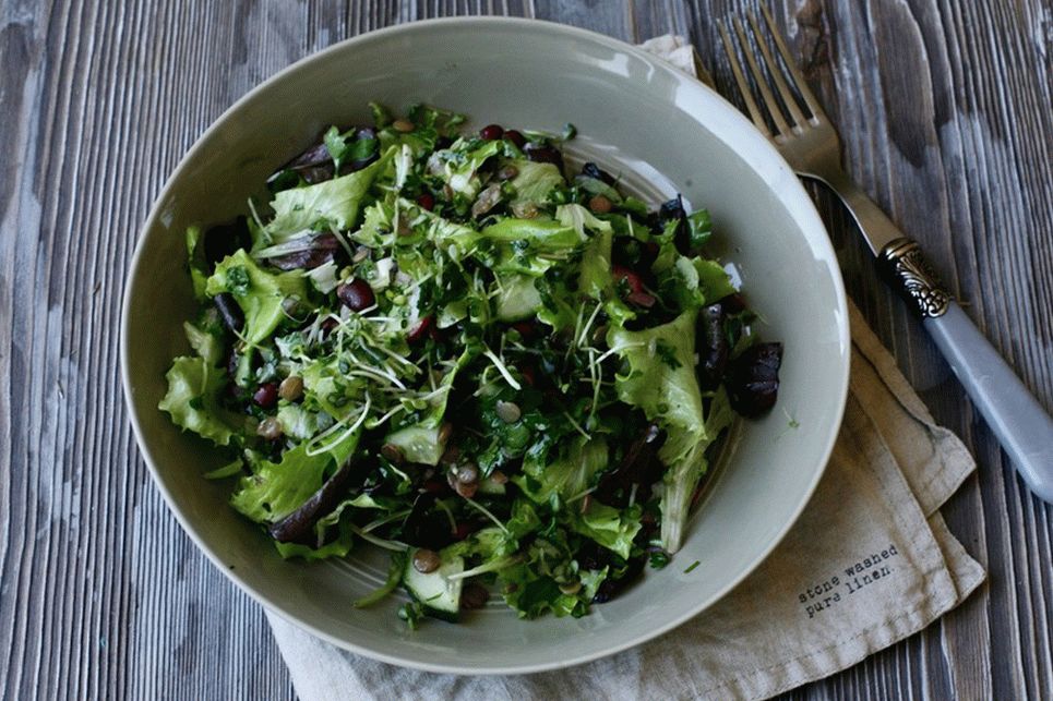 - Šalát, reďkovka, jemne nakrájaná uhorka a premiešajte s bylinkami, fazuľa a šošovica. Dochutíme soľou.