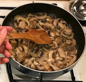 - Huby sú nakrájané, soľ, korenie a smažíme na masle.