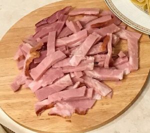 - Šunku nakrájajte na prúžky. Pridajte do húb.