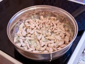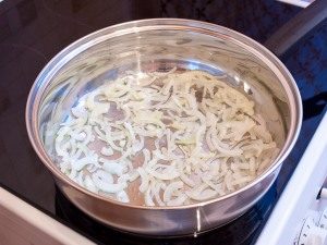 - Nakrájanú cibuľu opražte na panvici s rastlinným olejom.