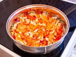 - Potom pridajte mrkvu, papriku, smažte ďalšie tri minúty.