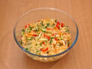 Lahodný šalát s funchose a zeleninou, tentokrát s kuracím mäsom. Toto jedlo môže nahradiť ľahkú večeru alebo môžete varte doma z morčacieho filé ako je uvedené na obale, pretože každý výrobca má svoj vlastný technológia výroby a jej prvotné suroviny.