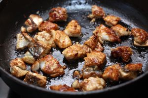 - Rezané filé nakrájajte na malé kúsky, namočte do marinády a nechajte pôsobiť 15 minút.
