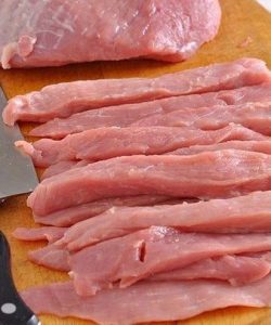 - Mäso sme nakrájali na prúžky s dĺžkou asi 8 až 10 centimetre, jeden centimeter hrubý a dva centimetre široký.