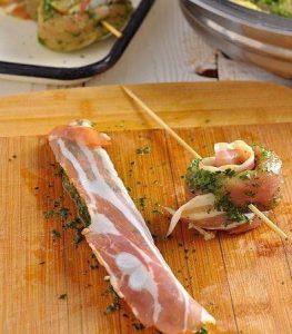 - Na prúžok mäsa položíme plátok hrude, otočíme sa rolka, šnúrka na špeciálnej drevenej špajdle.