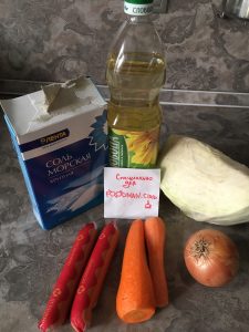 - Klobásy nakrájajte na krúžky a ľahko opečte na slnečnici olej. Potom pridajte kapustu, cibuľu a mrkvu, soľ, Zamiešame. Duste pod pokrievku na miernom ohni, kým sa neuvarí kapusta.