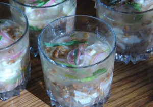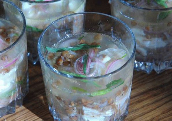 - Položte vysoké poháre na lyžicu šošovica, ryba, tri šalotky, potom ďalšia lyžica šošovky, zalejeme želatínovou omáčkou, posypeme estragónom, ochlaďte chladnička. Po hodine môžete slúžiť.