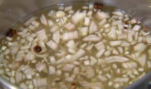 - Pripravte omáčku a vložte jednu do panvice nasekané šalotky, pridajte víno, pridajte klinčeky, korenie, zapálené, po varení nalejte vývar, varte, kým sa tretina nezníži.