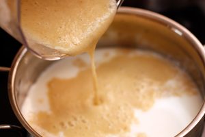 - Rozlomte čokoládu na malé kúsky, pridajte do panvice s nápojom.