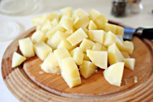 - Varenú a údenú klobásu sme nakrájame na malé štvorca.