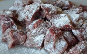 - Pripravený kúsok mäsa nakrájajte na kocky, soľ, korenie, posypeme múkou, premiešame.