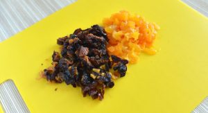 Jemne nasekajte sušené slivky a sušené marhule.