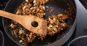 Sušte orechy na panvici s 3 lyžicami cukru za stáleho miešania čaká na neho karamelizácia.