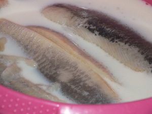 - Sleď slede, vyberte kosti, namočte do mlieka po dobu 30 minút.