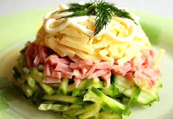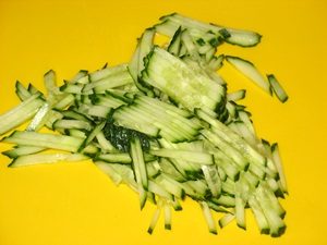 Podobne nasekajte šunku. Slama musí byť tenká pretože priamo ovplyvňuje chuť šalátu.