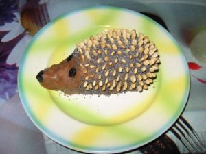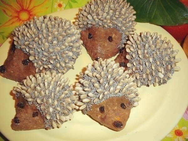 - Potom ozdobíme ježkovia: olúpané semená plnia úlohu ihiel, a zvyšuje úlohu nosa a očí.