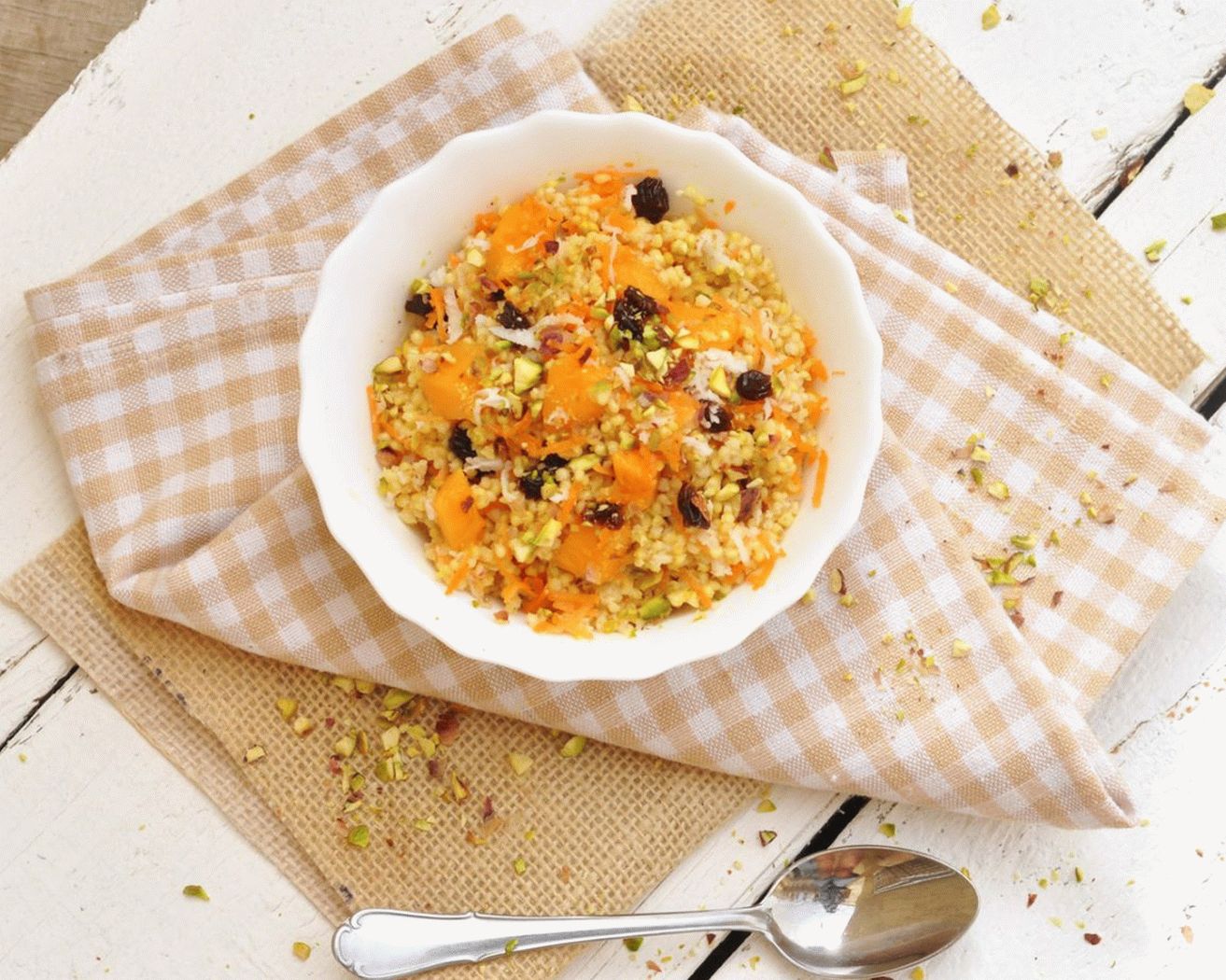 Po uvarení kaše a trochu vylúhovaní nalejte ju na dosku s porciami a pridajte ju na vrch kandizované ovocie.