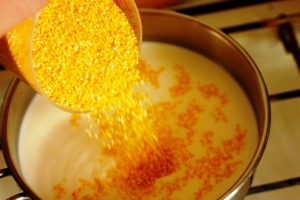 - Príprava kaše je jednoduchá: varte mlieko, prajte kukuricu cereálie, postupne ju nalejte do mlieka, dôkladne premiešajte.