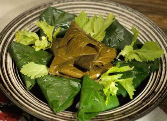 - Dajte 1 polievková lyžica. lyžice čerstvého a nakladaného hrozna listy, stočené do kapusty trojuholníkového tvaru.